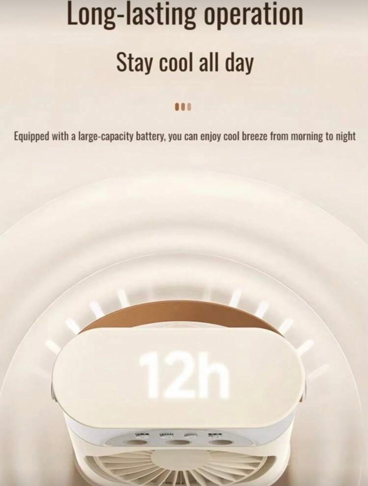 Designed for convenience and comfort, the BreezeMist features a large-capacity battery that lasts up to 12 hours on a single charge, so you can enjoy a cool breeze all day long. The adjustable mist function adds an extra chill by evaporating heat from the air — perfect for home, office, or outdoor use.